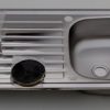 Acero 201 (Cr: 15% a 17%; Ni: 1% a 1.5%; Mn: 9.5%; Cu: 1.7%); Espesor Plancha: 0.6 mm. Con rebalse y Perforacion p/Desague de 1.1/2 (52 mm). Esquinas Soldadas. Alto sobre mesa: 30 mm. Profundidad Total: 160 mm. Bowl: 400 x 340 mm. Perforaciones para griferia: 2 Hoyos 35 mm. centros a 200 mm